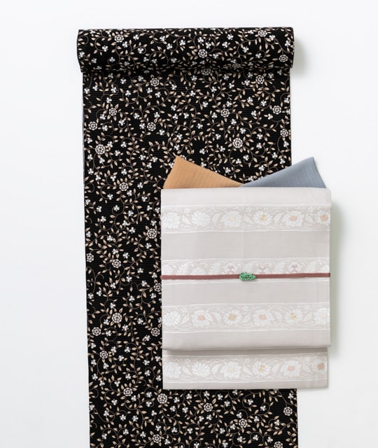 漆黒の地色に小ぶりの花唐草文。シックな中にも、さりげない可愛さを感じさせるオトナ女子のための1着。夏だからこそ、帯と明快なコントラストで軽やかさを。微妙なさじ加減のニュアンスカラー小物と職人技がつまった帯留めで、おしゃれ度数を引き上げて。