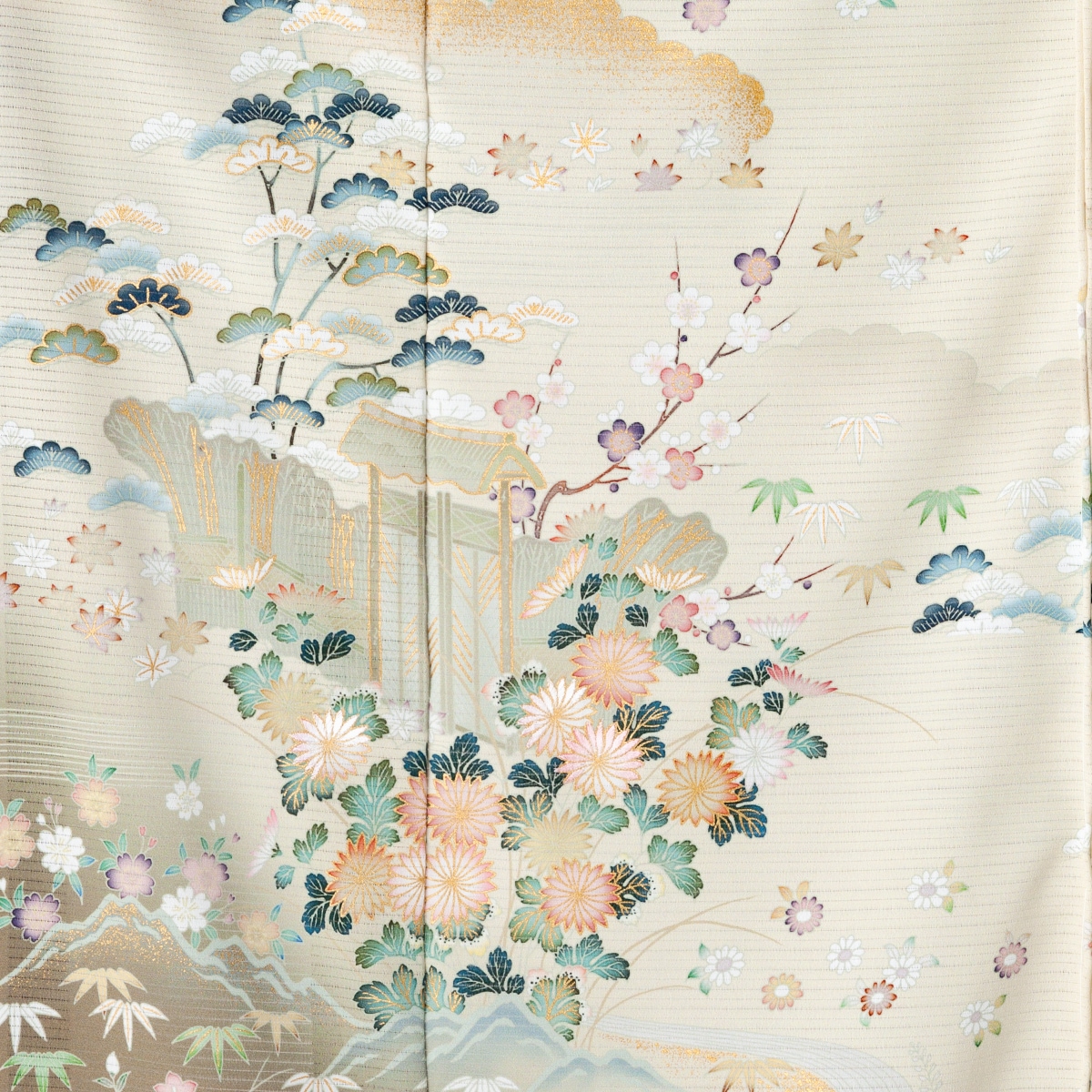 刺繍や箔があしらわれた古典的な茶屋辻柄の訪問着。加賀友禅風の虫食い表現が施されています。